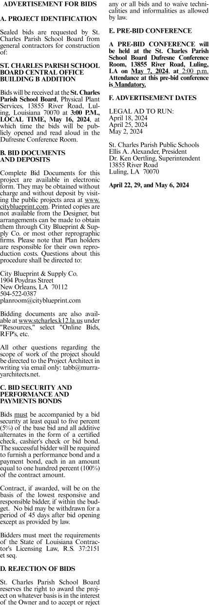 ADVERTISEMENT FOR BIDS . A. PROJECT IDENTIFICATION Sealed bids are requested by St. Charles Parish School Board from general contractors for construction of: ST. CHARLES PARISH SCHOOL BOARD CENTRAL OFFICE BUILDING B ADDITION Bids will be received at the St. Charles Parish School Board, Physical Plant Services, 13855 River Road, Luling, Louisiana 70070ADVERTISEMENT FOR BIDS .A. PROJECT IDENTIFICATION Sealed bids are requested by St. Charles Parish School Board from general contractors for construction of: ST. CHARLES PARISH SCHOOL BOARD CENTRAL OFFICE BUILDING B ADDITION Bids will be received at the St. Charles Parish School Board, Physical Plant Services, 13855 River Road, Luling, Louisiana 70070 at 3:00 P.M., LOCAL TIME, May 16, 2024, at which time the bids will be publicly opened and read aloud in the Dufresne Conference Room. B. BID DOCUMENTS AND DEPOSITS Complete Bid Documents for this project are available in electronic form. They may be obtained without charge and without deposit by visiting the public projects area at www.cityblueprint.com. Printed copies are not available from the Designer, but arrangements can be made to obtain them through City Blueprint & Supply Co. or most other reprographic firms. Please note that Plan holders are responsible for their own reproduction costs. Questions about this procedure shall be directed to: City Blueprint & Supply Co. 1904 Poydras Street New Orleans, LA 70112 504-522-0387 [email protected] Bidding documents are also available at www.stcharles.k12.la.us under "Resources," select "Online Bids, RFP's, etc. All other questions regarding the scope of work of the project should be directed to the Project Architect in writing via email only: [email protected]. C. BID SECURITY AND PERFORMANCE AND PAYMENTS BONDS Bids must be accompanied by a bid security at least equal to five percent (5%) of the base bid and all additive alternates in the form of a certified check, cashier's check or bid bond. The successful bidder will be required to furnish a performance bond and a payment bond, each in an amount equal to one hundred percent (100%) of the contract amount. Contract, if awarded, will be on the basis of the lowest responsive and responsible bidder, if within the budget. No bid may be withdrawn for a period of 45 days after bid opening except as provided by law. Bidders must meet the requirements of the State of Louisiana Contractor's Licensing Law, R.S. 37:2151 et seq. D. REJECTION OF BIDS St. Charles Parish School Board reserves the right to award the project on whatever basis is in the interest of the Owner and to accept or reject any or all bids and to waive technicalities and informalities as allowed by law. E. PRE-BID CONFERENCE A PRE-BID CONFERENCE will be held at the St. Charles Parish School Board Dufresne Conference Room, 13855 River Road, Luling, LA on May 7, 2024, at 2:00 p.m. Attendance at this pre-bid conference is Mandatory. F. ADVERTISEMENT DATES LEGAL AD TO RUN: April 18, 2024 April 25, 2024 May 2, 2024 St. Charles Parish Public Schools Ellis A. Alexander, President Dr. Ken Oertling, Superintendent 13855 River Road Luling, LA 70070 April 22, 29, and May 6, 2024