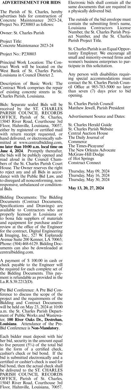 ADVERTISEMENT FOR BIDS . The Parish of St. Charles, hereby advertises bids for construction of Concrete Maintenance 2023-24, Project No. P230803 as follows: Owner: St. Charles Parish Project Title: Concrete Maintenance 2023-24 Project No.: P230803 Principal Work Location: The Contract Work will be located on the West Bank of St. Charles Parish, Louisiana in Council District 2. Description of Basic Work: The Contract Work comprises the reADVERTISEMENT FOR BIDS .The Parish of St. Charles, hereby advertises bids for construction of Concrete Maintenance 2023-24, Project No. P230803 as follows: Owner: St. Charles Parish Project Title: Concrete Maintenance 2023-24 Project No.: P230803 Principal Work Location: The Contract Work will be located on the West Bank of St. Charles Parish, Louisiana in Council District 2. Description of Basic Work: The Contract Work comprises the repair of existing concrete streets in St. Charles Parish, Louisiana. Bids: Separate sealed Bids will be received by the ST. CHARLES PARISH COUNCIL RECORDS OFFICE, Parish of St. Charles, 15045 River Road, Courthouse 3rd Floor, Hahnville, Louisiana, 70057, either by registered or certified mail with return receipt requested, or hand delivered, or electronically submitted at www.centralbidding.com, no later than 10:00 a.m. local time on June 4, 2024. Promptly thereafter, the bids will be publicly opened and read aloud in the Council Chambers of the St. Charles Parish Court House. The Owner reserves the right to reject any and all Bids in accordance with the Public Bid Law, and to disregard all nonconforming, nonresponsive, unbalanced or conditional Bids. Bidding Documents: The Bidding Documents (Contract Documents, Specifications and Drawings) are available to Contractors who are properly licensed in Louisiana or to bona fide suppliers of materials and equipment for purchase and/or review at the office of the Engineer for the contract, Digital Engineering & Imaging, Inc., 527 W. Esplanade Avenue Suite 200 Kenner, LA 70065; Phone: (504) 468-6129. Bidding Documents can also be downloaded at centralbidding.com. A payment of $ 100.00 in cash or check payable to the Engineer will be required for each complete set of the Bidding Documents. This payment is refundable as provided in the La.R.S.38:2212(D). Pre Bid Conference: A Pre Bid Conference to discuss the scope of the project and the requirements of the Bidding and Contract Documents will be held on May 23, 2024 at 10:00 a.m. the St. Charles Parish Department of Public Works and Wastewater, 100 River Oaks Dr., Destrehan, Louisiana. Attendance of the Pre-Bid Conference is Non-Mandatory. Each bidder must deposit with his/her bid, security in the amount equal to five percent (5%) of the total bid in the form of a certified check, cashier's check or bid bond. If the bid is submitted electronically and a certified or cashier's check is used for bid bond, then the actual check shall be delivered to the ST. CHARLES PARISH COUNCIL RECORDS OFFICE, Parish of St. Charles, 15045 River Road, Courthouse 3rd Floor, Hahnville, Louisiana, 70057. Electronic bids shall contain all the same documents that are required in a physically delivered bid. The outside of the bid envelope must contain the submitting firm's name, Louisiana Contractors License Number, the St. Charles Parish Project Number, and the St. Charles Parish Project Title. St. Charles Parish is an Equal Opportunity Employer. We encourage all small and minority-owned firms and women's business enterprises to participate in this solicitation. Any person with disabilities requiring special accommodations must contact the St. Charles Parish Council Office at 985-783-5000 no later than seven (7) days prior to bid opening. St. Charles Parish Council Matthew Jewell, Parish President Advertisement Source and Dates: St. Charles Herald Guide St. Charles Parish Website Central Auction House The Daily Journal of Commerce The Times-Picayune/ The New Orleans Advocate McGraw-Hill Dodge of Hot Springs Construct Connect Thursday, May 09, 2024 Thursday, May 16, 2024 Thursday, May 30, 2024 May 13, 20, 27, 2024